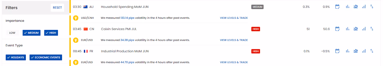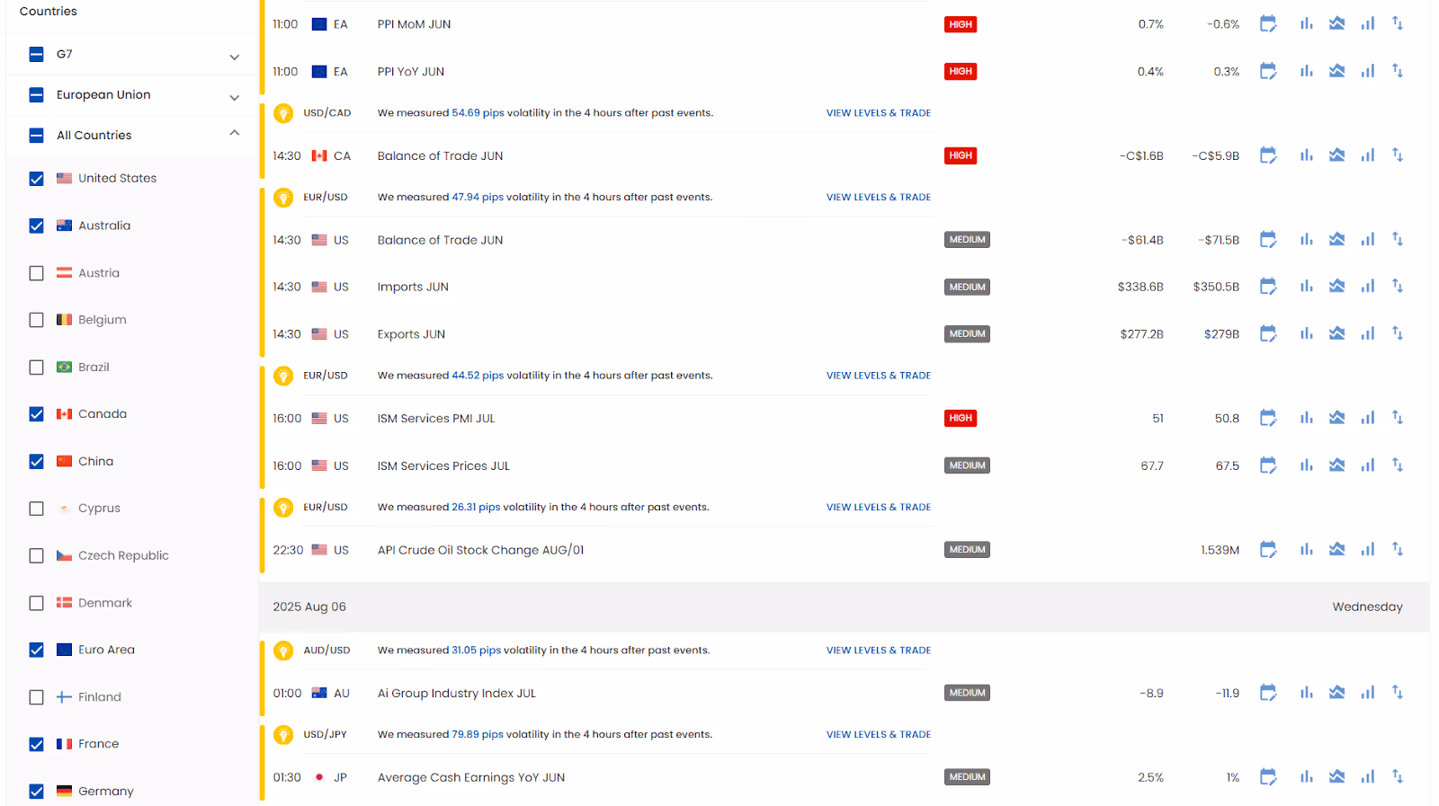 We can select economic data of "High", "Medium" or "Low" importance, or any combination of such filters: