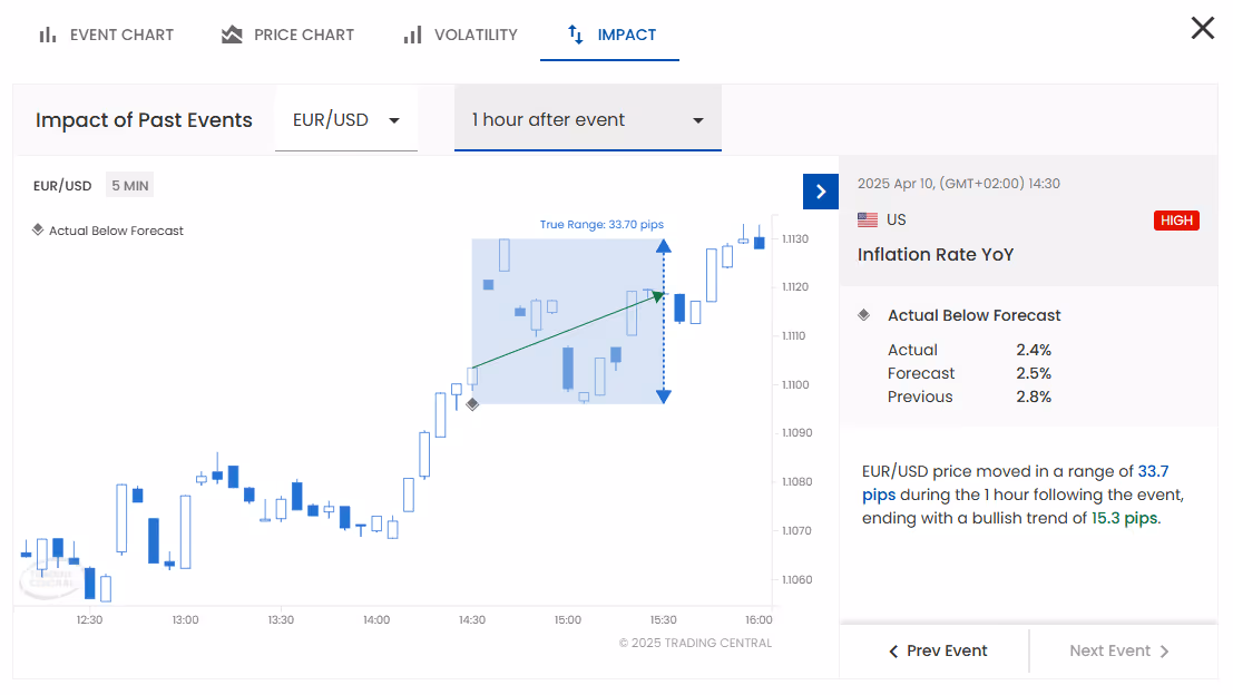 Last month, within one hour from the release of major U.S. inflation data, EUR/USD moved in a range of 33.7 pips during the 1 hour following the event, ending 15.3 pips higher.
