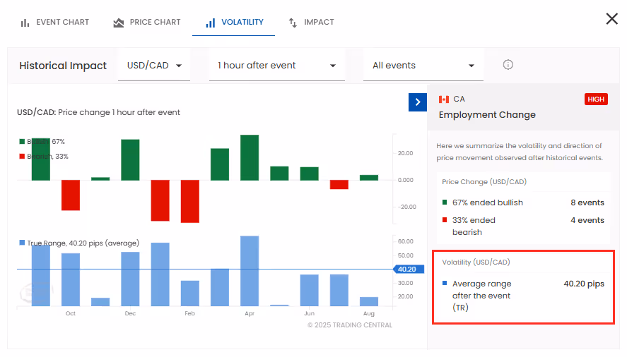 In the Impact session, you can see that last time USD/CAD moved in a range of 20 pips during the hour after the data release:
