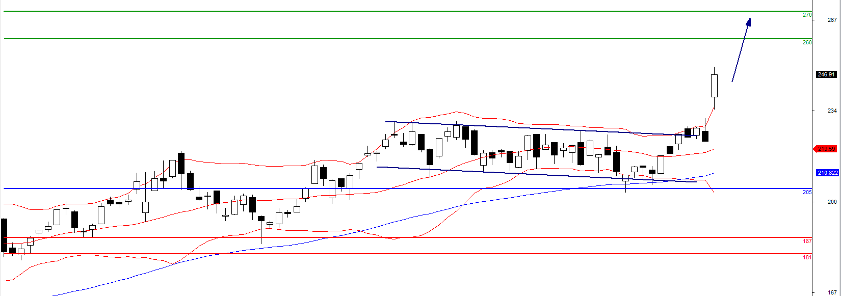 Regarding technical analysis, from a daily point of view, a bullish continuation pattern in flag (developed since Sept 11th) has been confirmed this week. Furthermore, from a weekly perspective, by exceeding $222, which was the previous record set in 2021 (approached in August 2025), the stock broke free from any additional technical constraints. Thus, as long as $205 is a support threshold, Trading Central sees a target area around $260-$270.